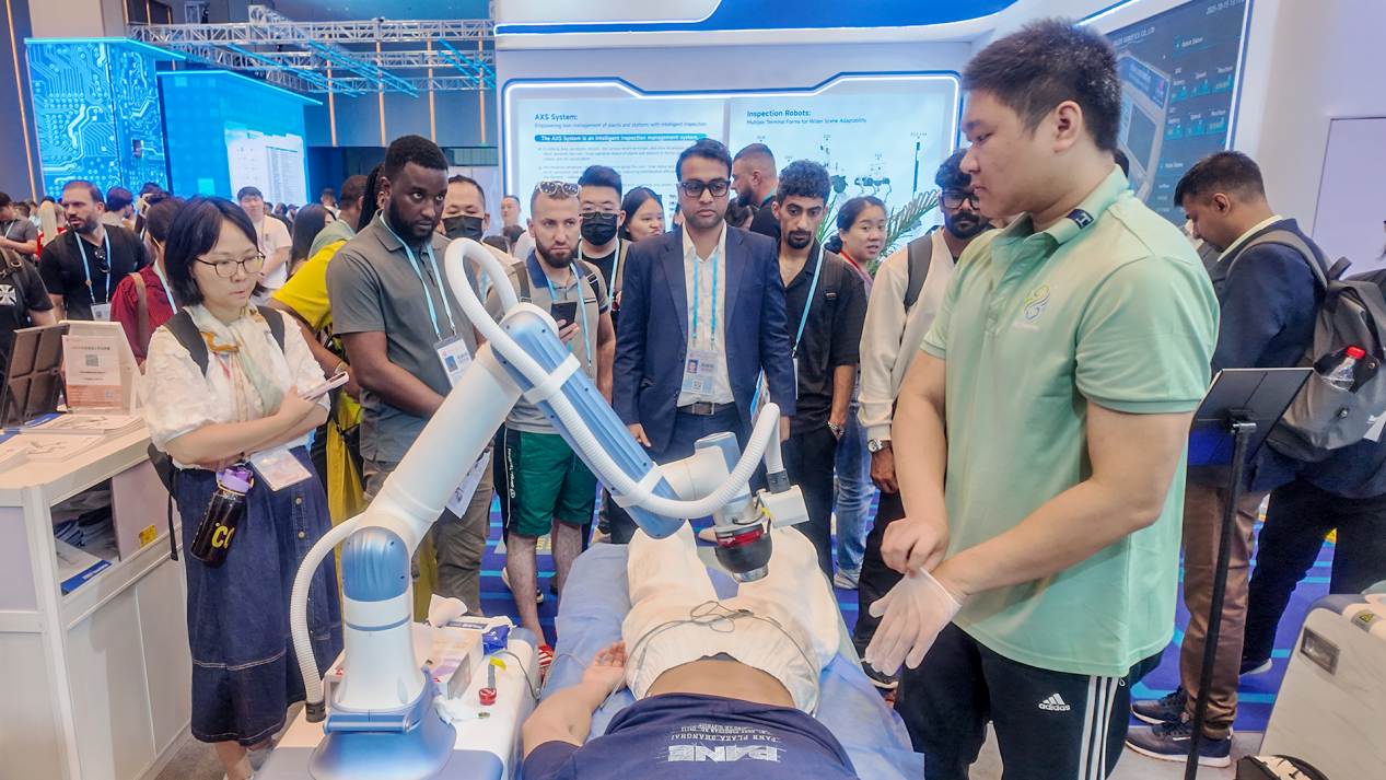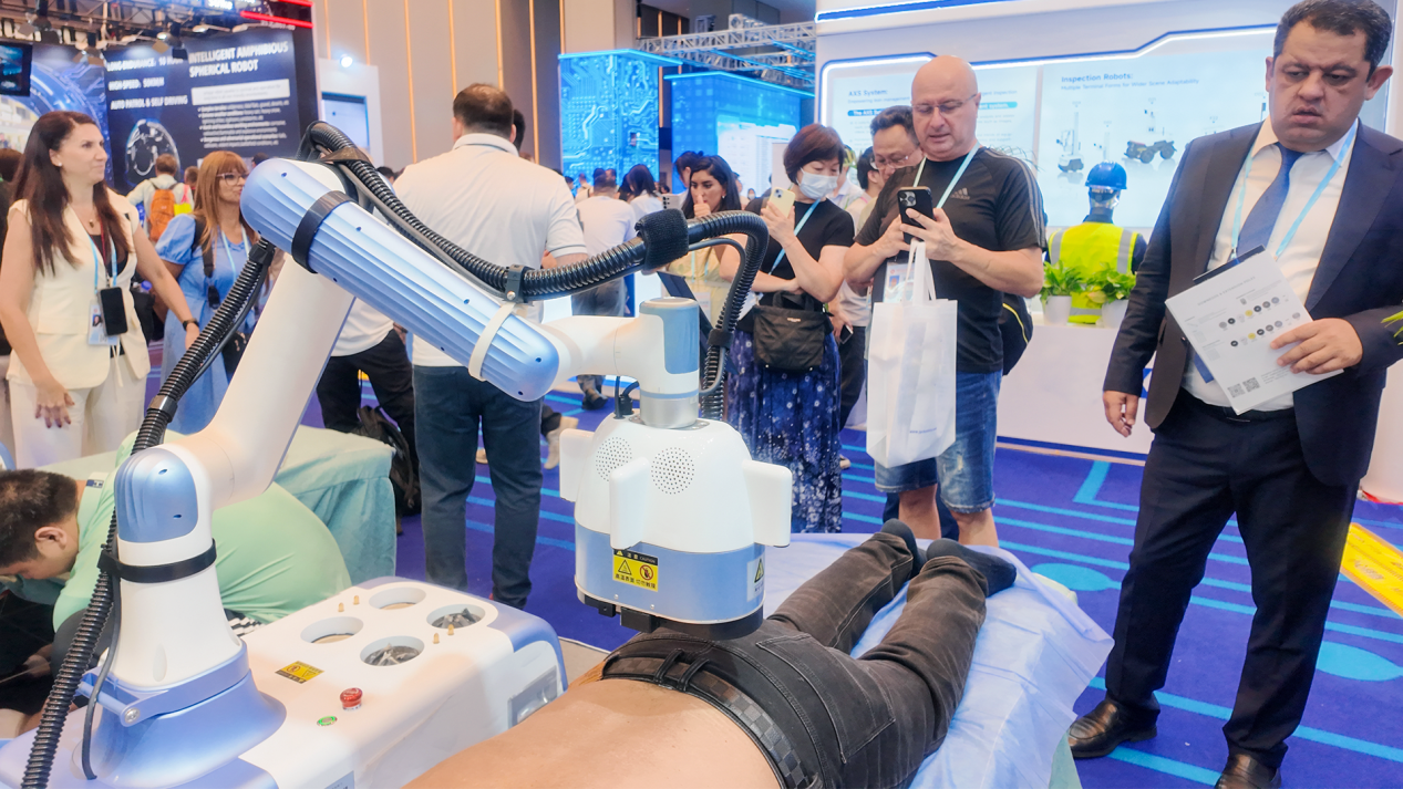 现场,筋膜推拿机器东谈主通过多功能力控推拿头与AI大模子集会,已毕动态东谈主机合作、自主学习进化功能,可及时感知东谈主体情状,精确识别穴位,集会内热、旋磁等多种理疗功能,智能疗养力度与热量,为客户提供个性化的筋膜调度,比好意思专科理疗师,现在已等闲落地中医馆、养老院、洞开康复等多种场景。